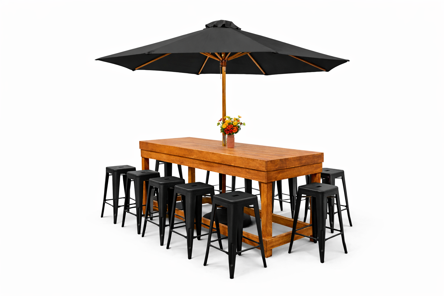 1 × Ten-Seater Table & Stools with Black Umbrella