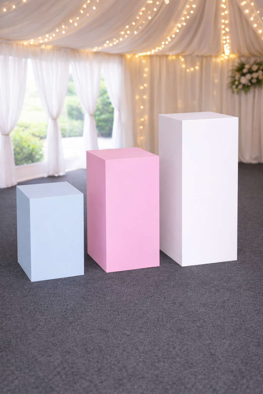 Our beautifully crafted solid display plinths are the perfect addition to elevate your next event. Whether showcasing cakes, florals, drink stations, or feature decor, these plinths offer a clean and stylish presentation.
