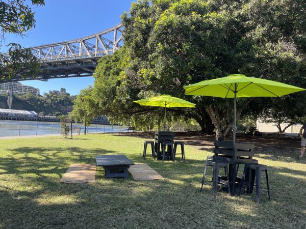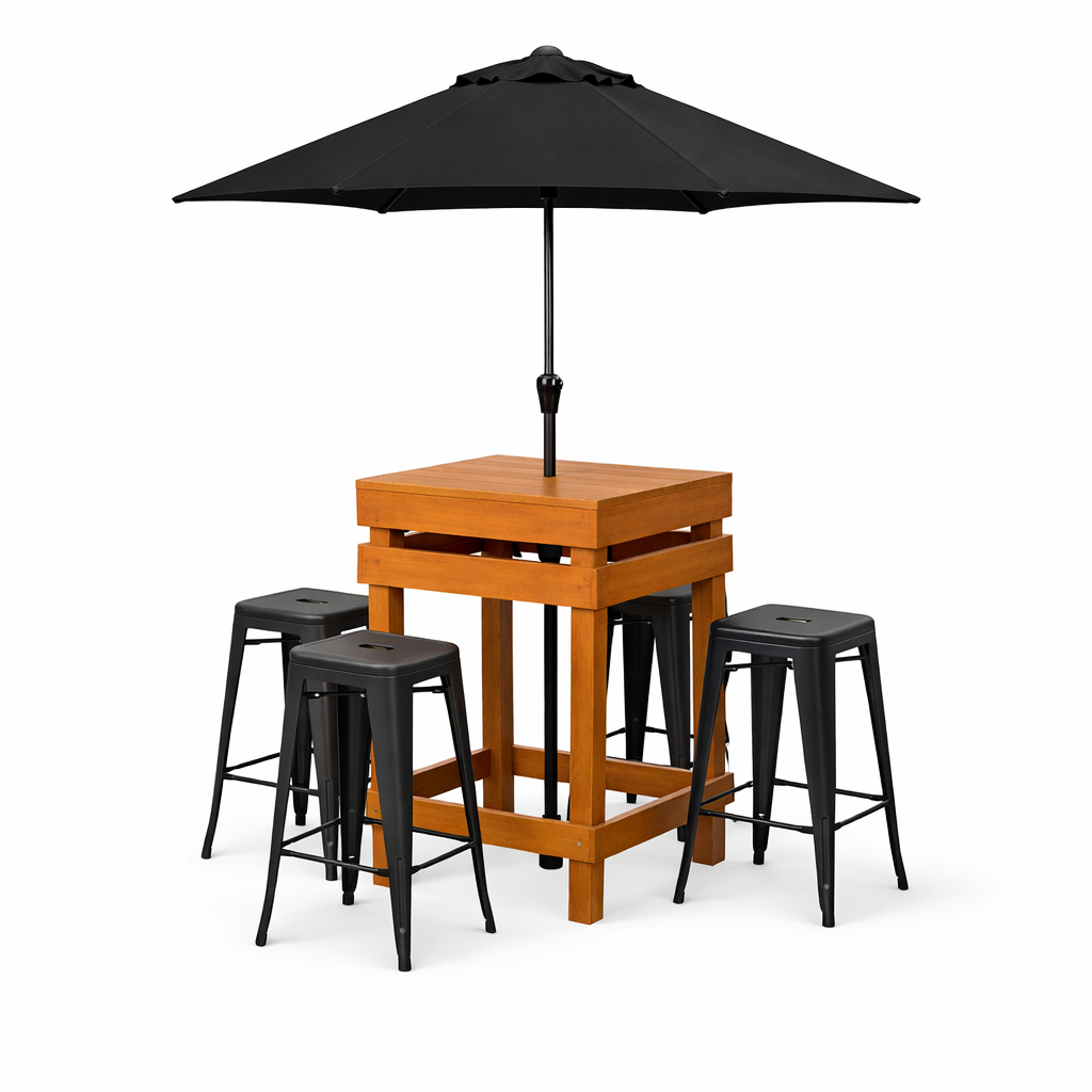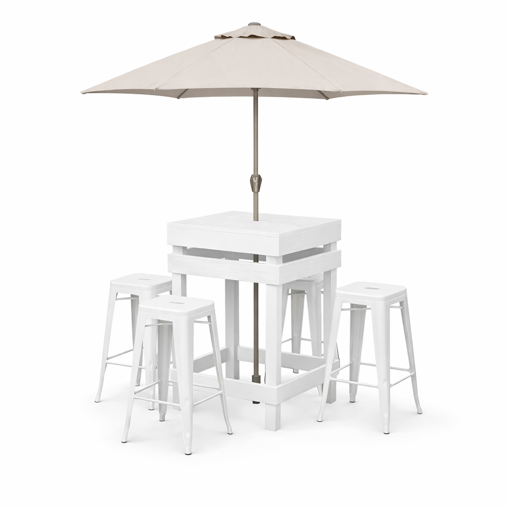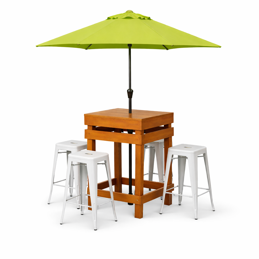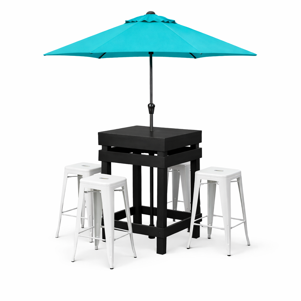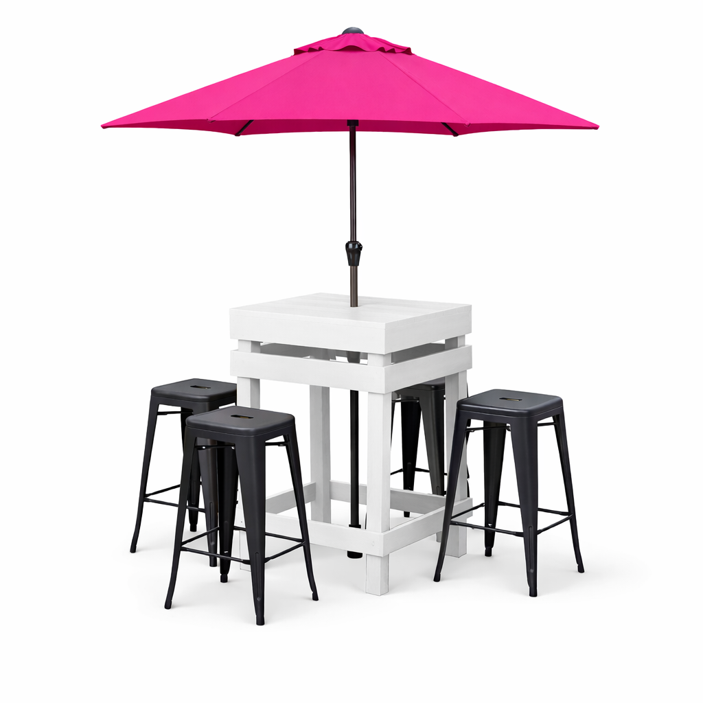Bar Table + 4 Stools + Umbrella & Base – $85