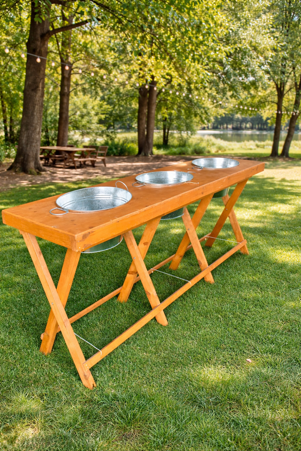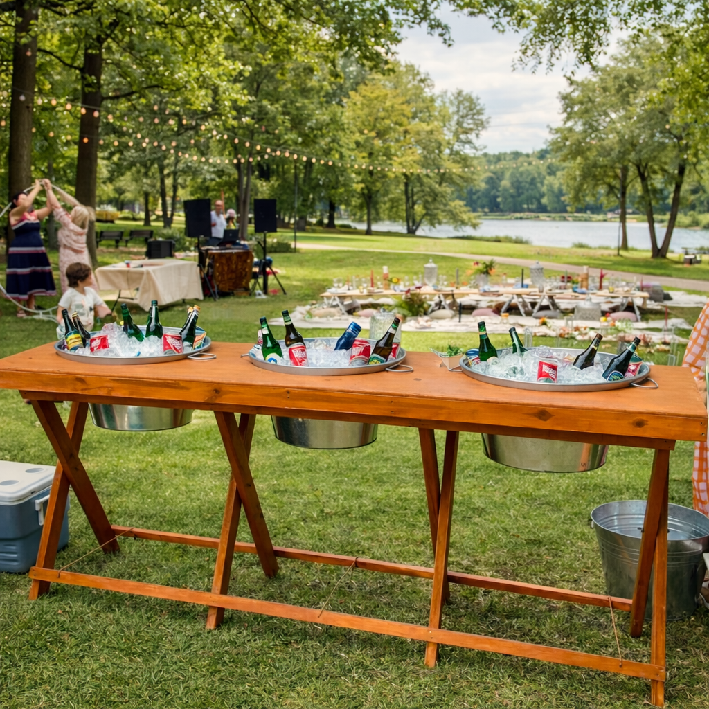 2.2m long Rustic Table with 3 x ICE / DRINKS BUCKETS Inside, Folding legs