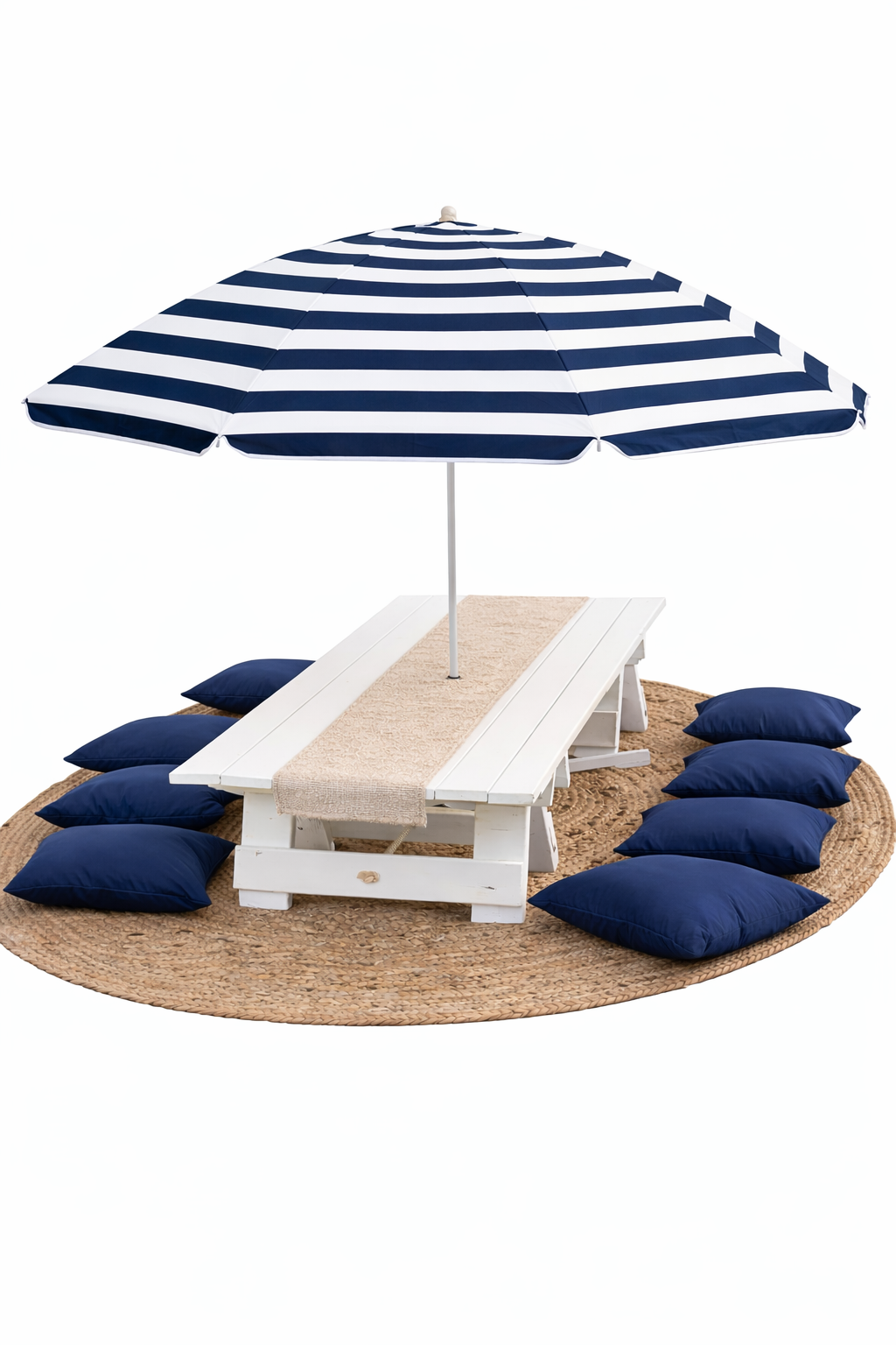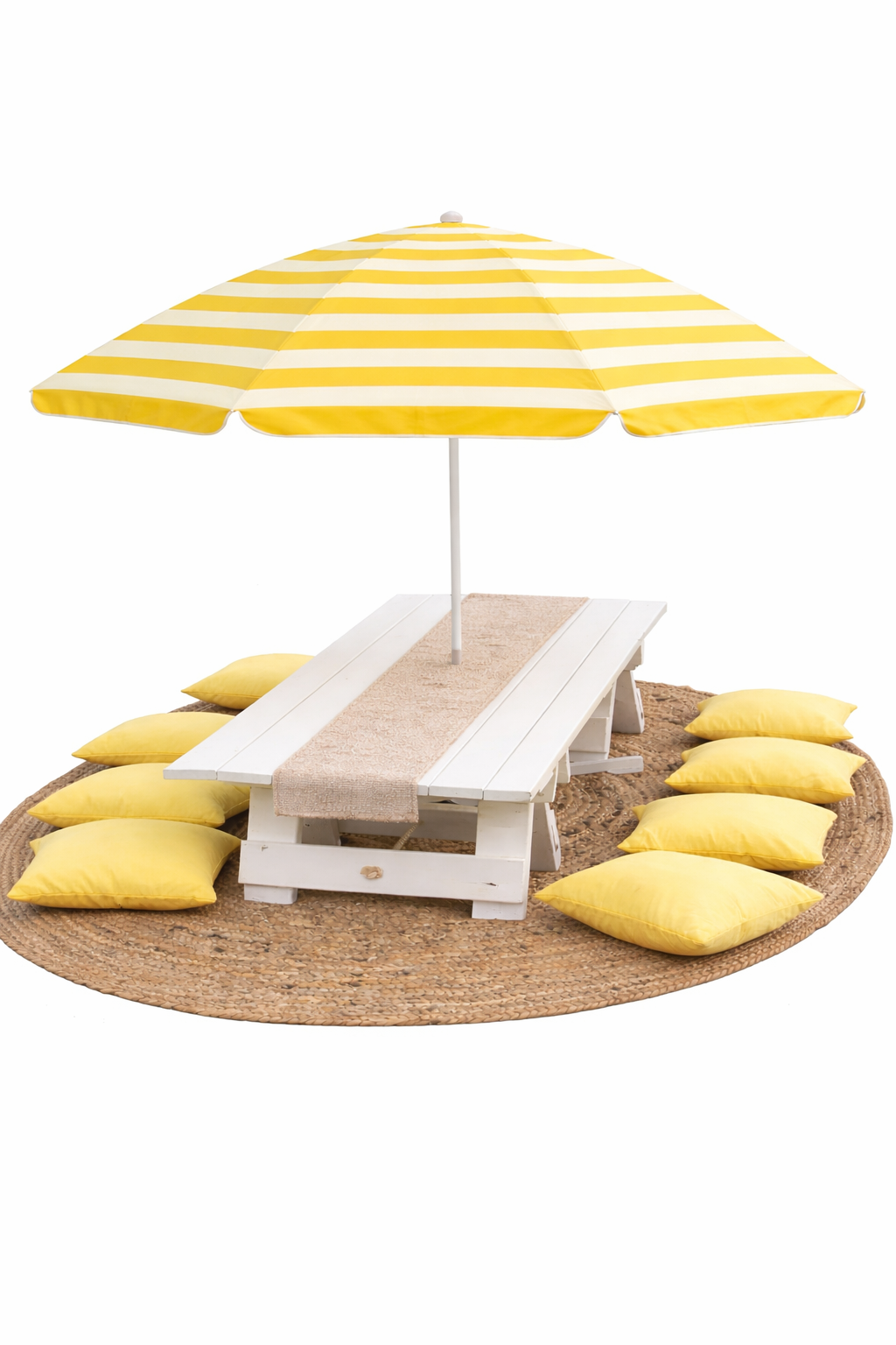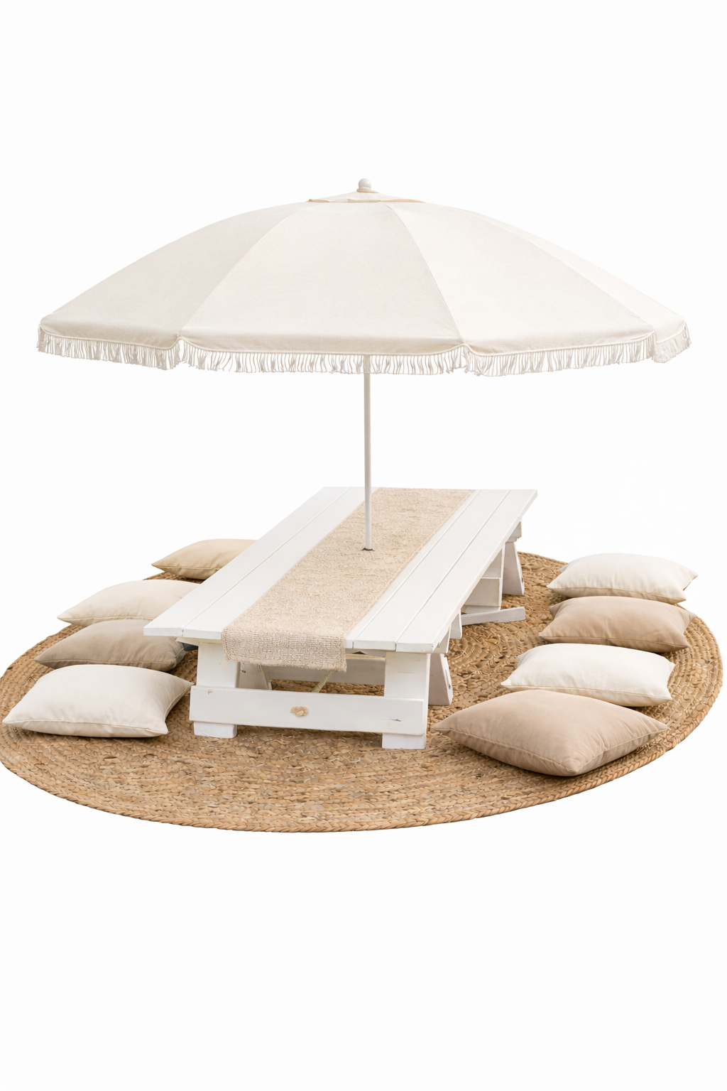 This bundle includes a low white picnic table styled with a soft table runner, floor cushions for comfortable seating, and a matching umbrella with base to provide shade and elevate the look. Finished with a natural round rug, this setup is both practical and visually stunning.