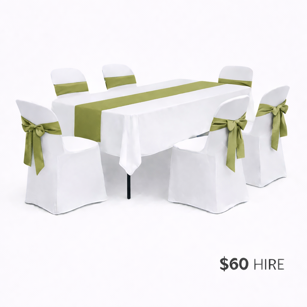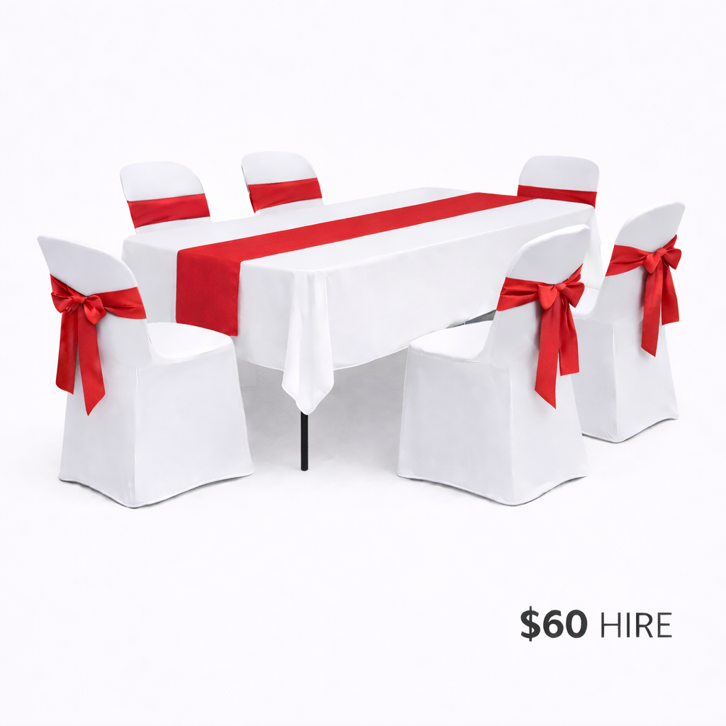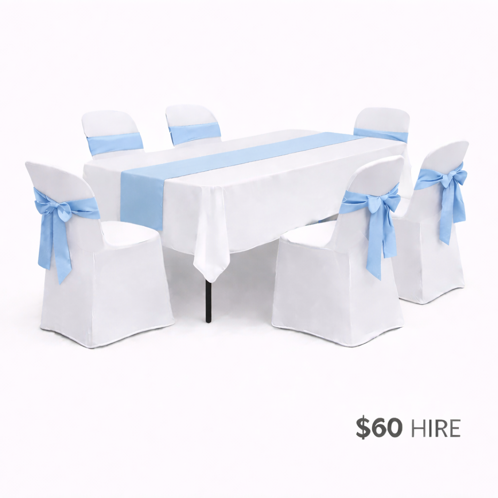 • 1 x white rectangular tablecloth (linen style – not lycra, drops just past seat height)