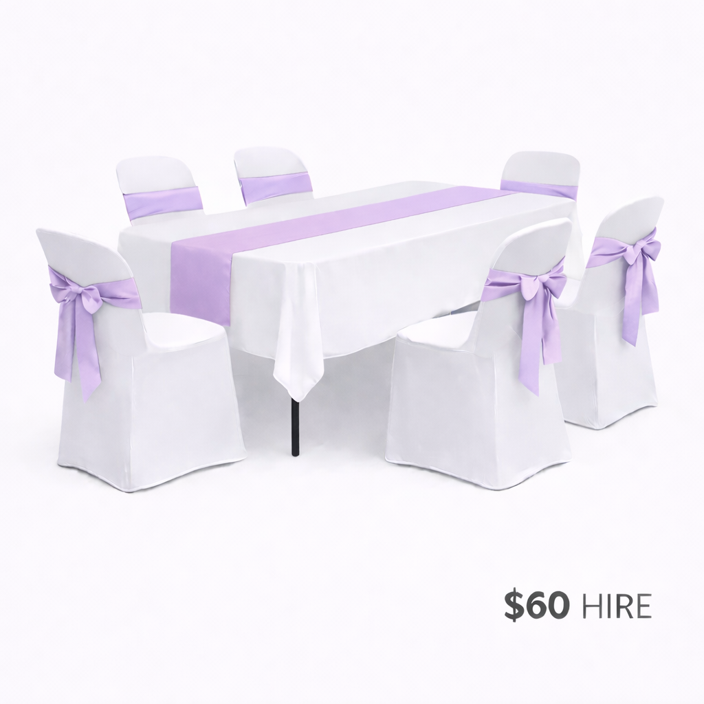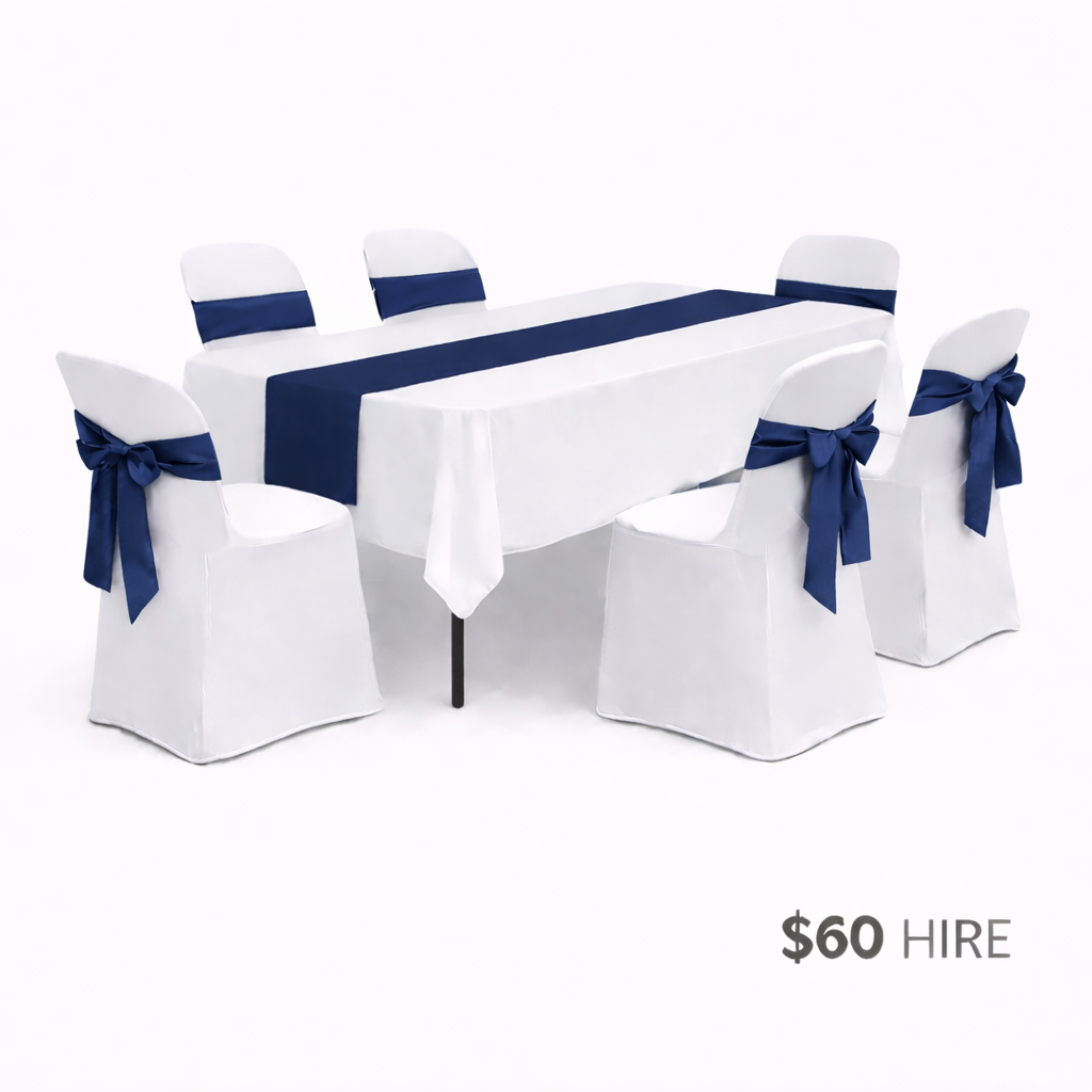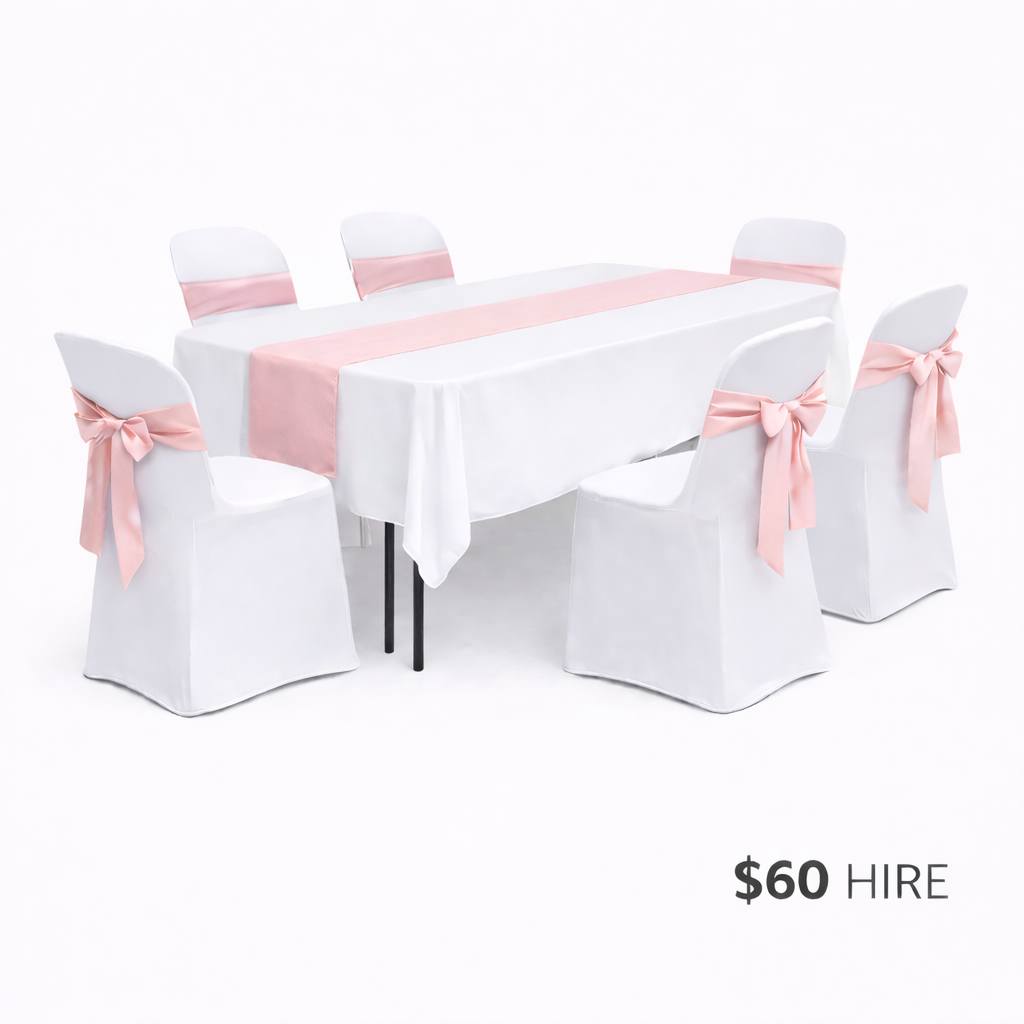 • 1 x white rectangular tablecloth (linen style – not lycra, drops just past seat height)