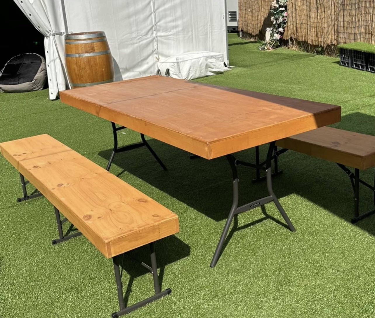 The wooden toppers sit neatly over the lifetime tables and benches, instantly transforming them into a beautiful, event-ready setting while keeping the convenience and stability of commercial-grade furniture.