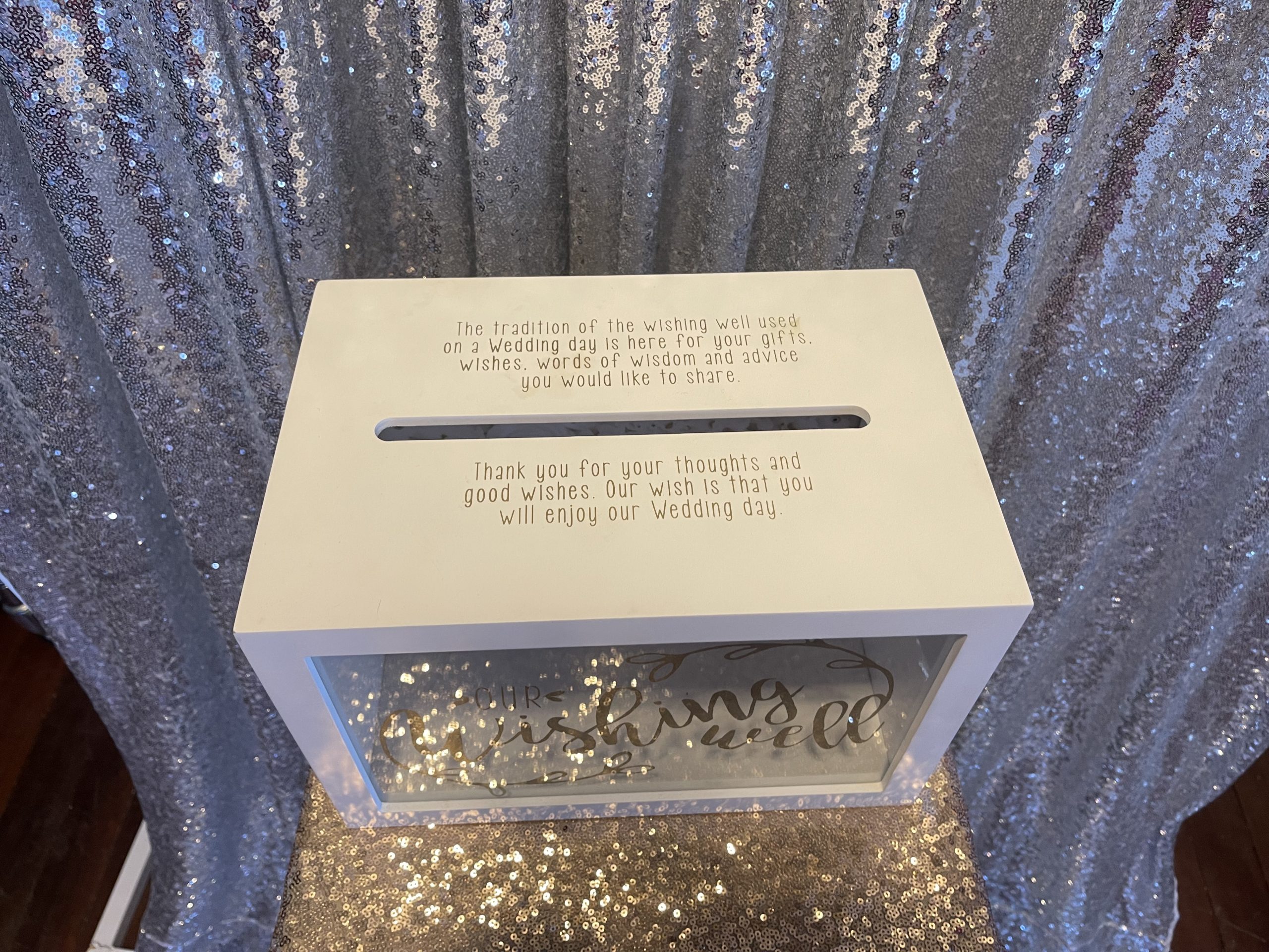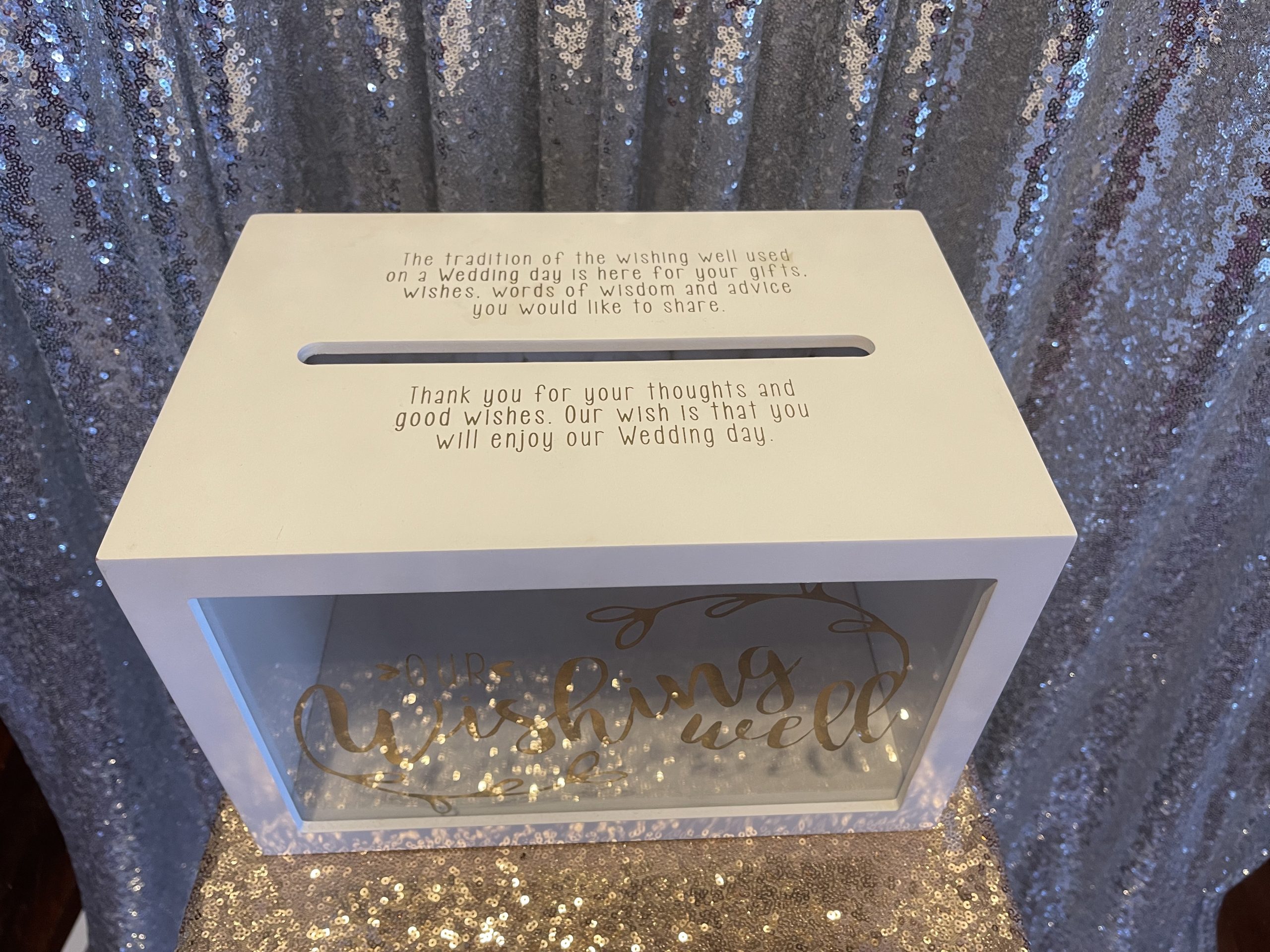 Our wishing well gold writing on the front of this white box with white floral background and beautiful words on the top with the large card slot